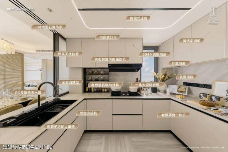 帝朗多功能大单槽,悍高天使拉篮、RO反渗透净水器、博洛尼橱柜,还有隐藏式凉霸,都是中高端品牌。