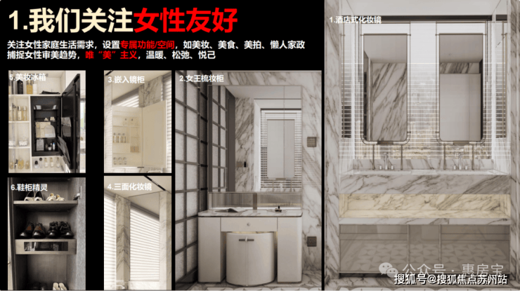 项目特别关注女性家庭生活需求,设置了专属功能空间,如酒店式化妆镜、女王梳妆柜、嵌入镜柜、三面化妆镜、美妆冰箱等,充分考虑女性的审美与生活习惯。创新性地在主卫利用飘窗设置台盆,释放空间打造超级梳妆收纳空间。