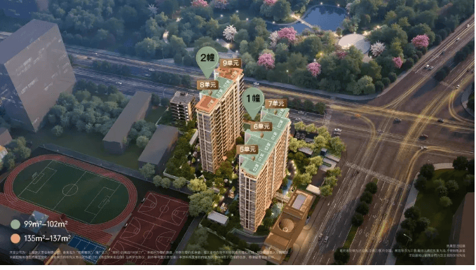 产品类型:建面约99-137㎡的3-4房,主力户型为99-102㎡三房和135-137㎡四房,总价约1100-2100万。