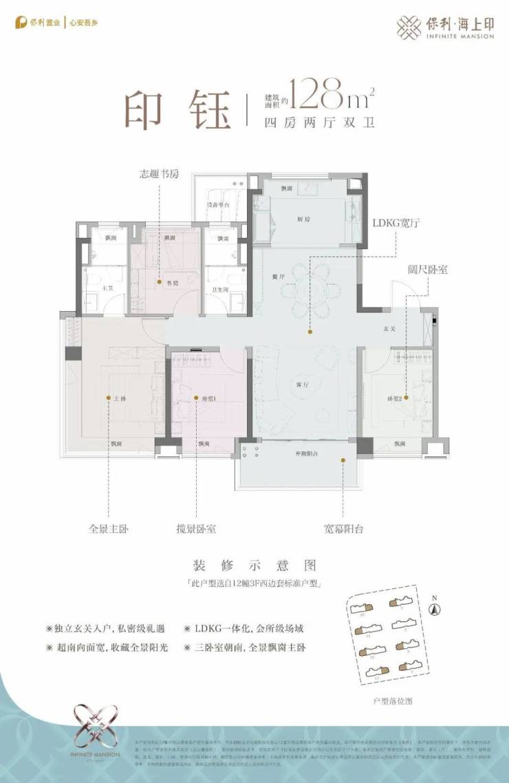 建面约128㎡4房2厅2卫,独立入户玄关,四开间朝南,客厅面宽约4.05米,南北直通,厨房附赠飘窗,可增加实用面积,边套户型主卧为270转角飘窗。⤴️ 保利·海上印售楼处热线☎️☎️:400-9966-940✨✽✽✽✽