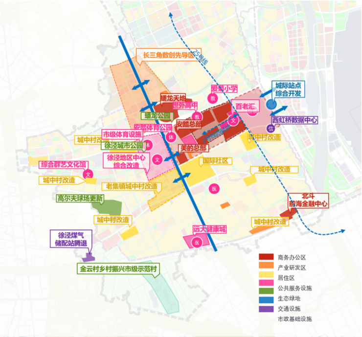 “长三角数创先导区”是西虹桥最主要的创新功能聚集区。凭借其强大的产业基础和三轨综合优势。作为徐泾的核心区内的品质住区得到了创智产业的集中赋能,成为大虹桥地区最佳的居住和工作选择。(信息来源:《中近期规划》)