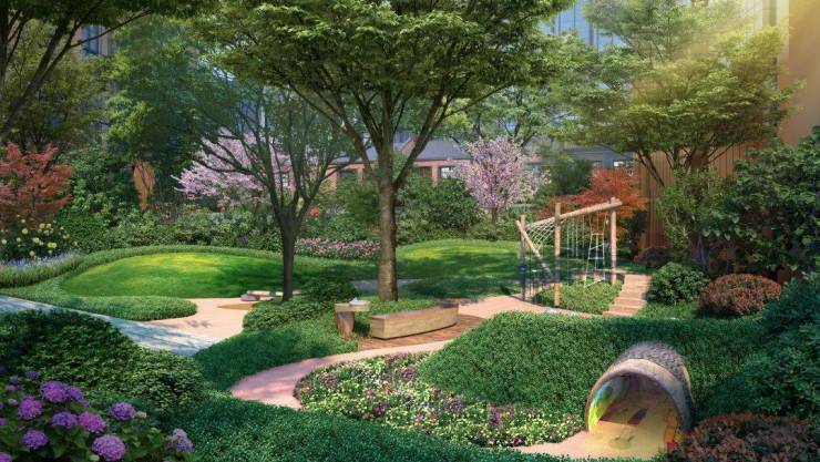 社区入口采用了 酒店式环岛落客区设计,并且中庭配备了 约3500㎡具有“公园感”的中央庭院,社区内利用不同的植物形态表现提升景观空间的品质,营造典雅精致的植物景观,将归家仪式和日常休闲的体验感拉满。