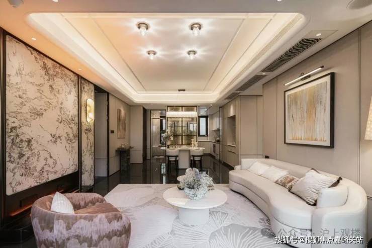 餐客厅岩板铺装:全屋餐客厅地面采用2.4米×1.2米超规格岩板交付,较市面豪宅最大约1.8米*0.9米的标准上, 在尺度上提升了约77.8%,大版面连纹设计减少拼接痕迹,呈现如整块天然石材般的视觉震撼。