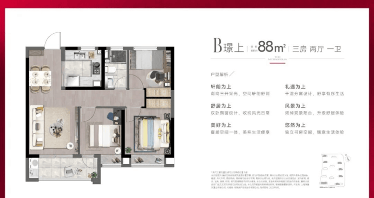 主推建面约88-98㎡3房,过会均价为33340元/㎡!