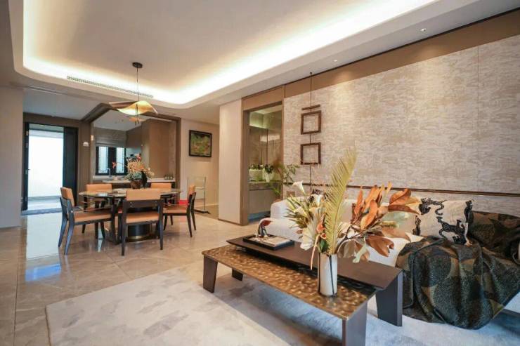 客厅、餐厅采用一体分段式设计,功能相互独立,空间却能互通。客厅开间约3.95米,奢阔会客厅设计,尽显主人的待客之道。