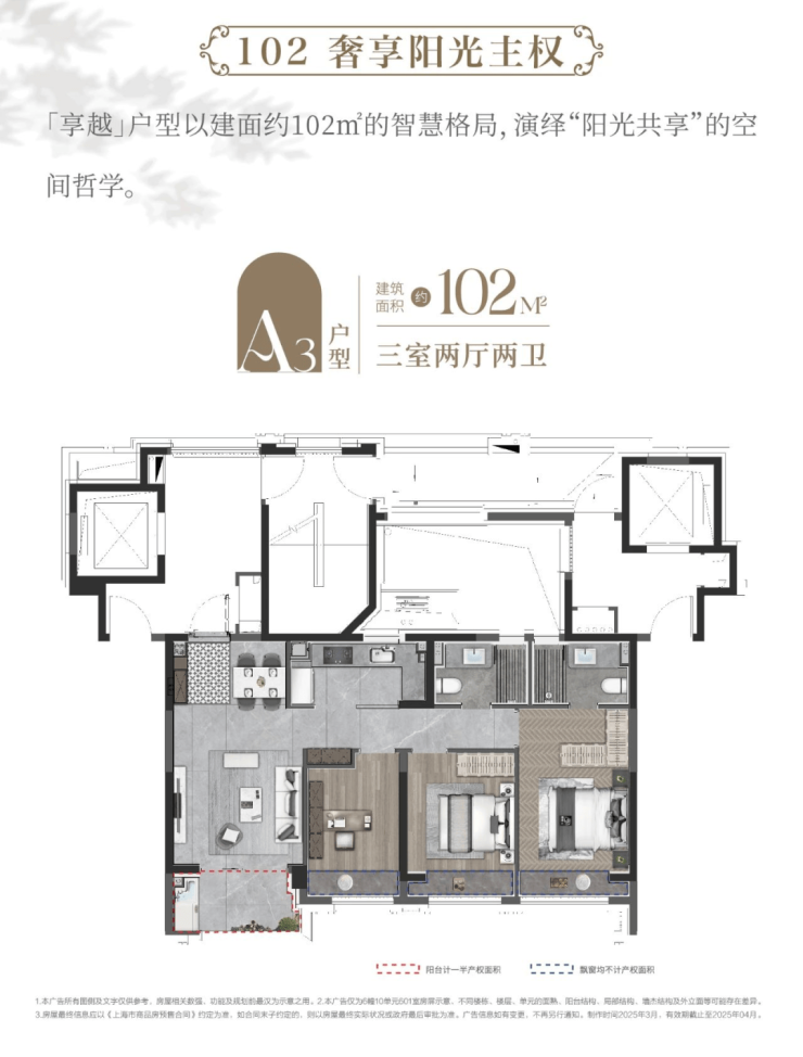 这套建面约103㎡动静分离户型打破常规,兼具三个房间和南向超阔面宽的横厅,以此承载从二人世界到三代同堂的全生命周期需求。