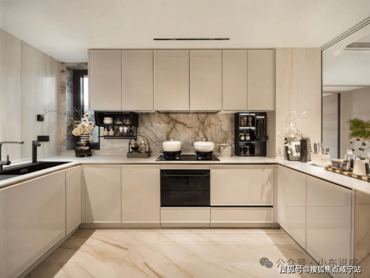 全屋墙面地面更是大量采用高规格岩板铺贴,客厅背景墙岩板交付,除墙布外饰面板优雅包裹更显格调,橱柜连岩板岛台都交付!