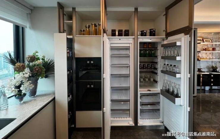 所选用的芬迪蓝大理石,以其独特的纹理和色彩组合,被誉为“石头的奢侈品”。172㎡厨房区域同样超配嘉格纳七件套,配置奢侈品级厨电,只为将居家氛围感提升至“Next level”。厨房地柜拉篮、上柜全维收纳系统,与双开门大尺度冰箱、多功能烤箱等厨电奢品,以高端性能和合理格局,承载米其林级家宴。