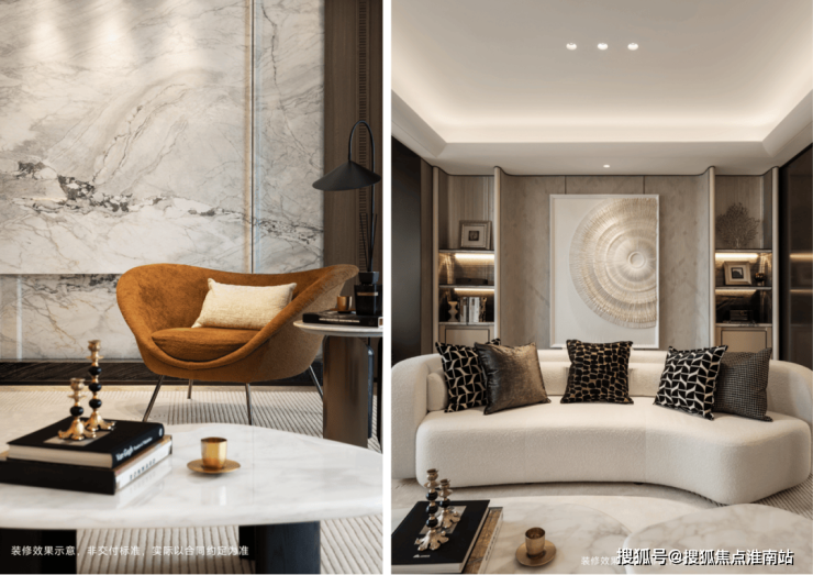 室内大量铺设珍稀石材,客厅背景墙选用意大利阿普那的奢石,为了呈现更好的视觉效果,金茂不惜成本做立体弧面造型处理,地面采用香奈儿灰、星耀灰等大理石拼花,餐边柜、主卧衣柜、梳妆台均纳入交付范围。
