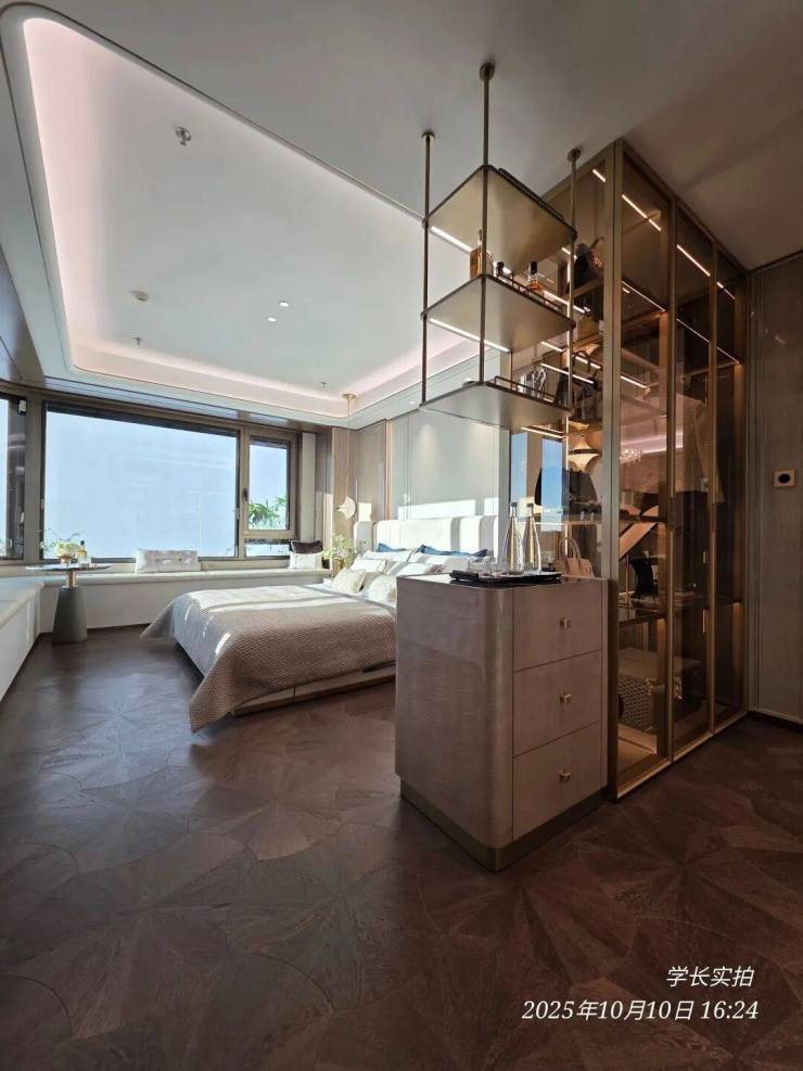 这是125㎡样板间的“女神卫浴”空间,专门利用镜面光、顶光、侧边光墙打造了一个协同光域场,让你站在镜前不会感到传统光源的刺眼,光线均匀柔和洒下,让你在梳妆时每个细节都纤毫毕现。