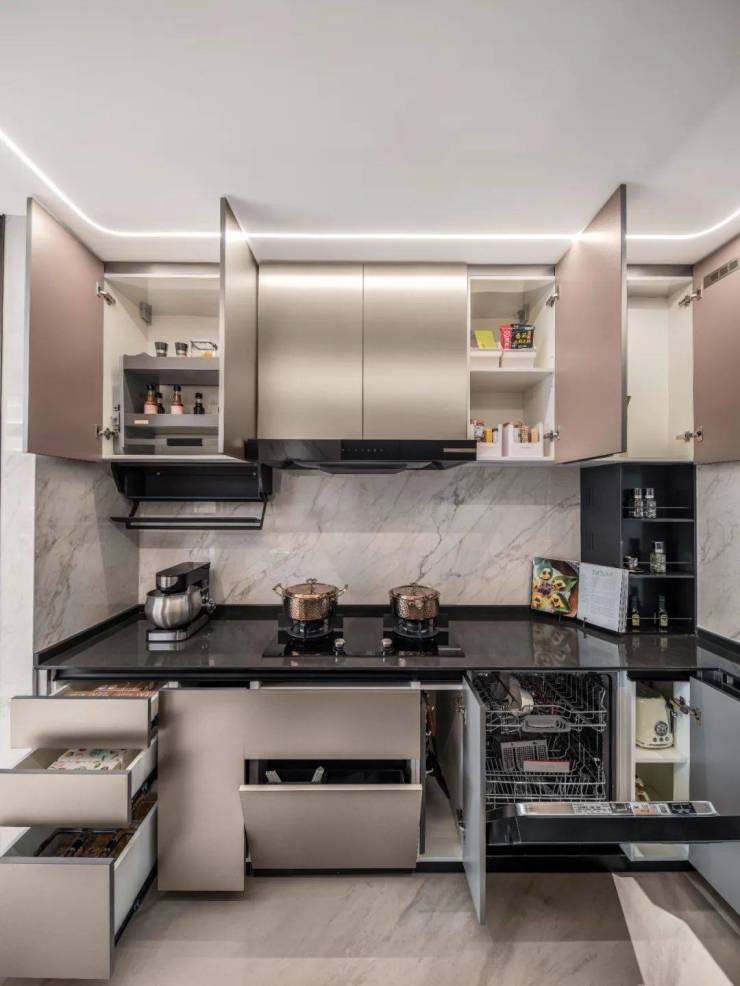 而在厨房,这种极致收纳的思维被简化为“一步原则”:收纳空间全部打开,几乎能填满整个厨房空间,这些收纳空间不是随意塞满的,而是根据日常烹饪习惯的频率来贴心规划的,能保证你在操作半径内触手可得,整个烹饪能一气呵成。
