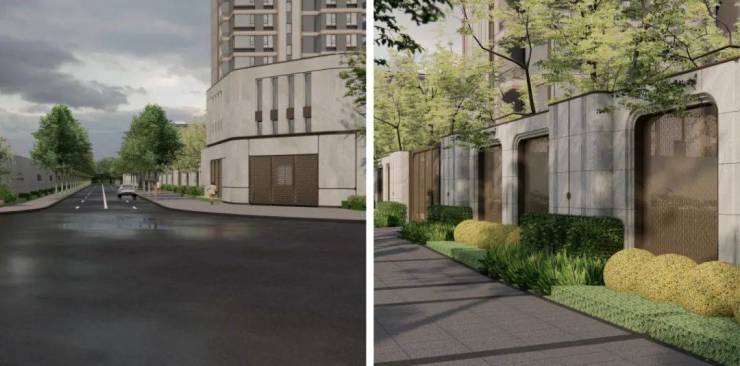 大面的水墨云灰石材贯穿形象大门和单元门头,并搭配精致的金属塔冠设计,以时尚主义营造手法,创造城市的审美张力,贴合现代人的审美需求。