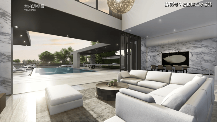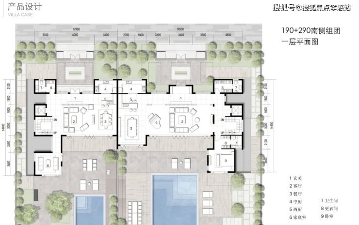 北入户的190+290房型,一层朝南直面庭院和泳池,如果配上整扇的落地玻璃移门......