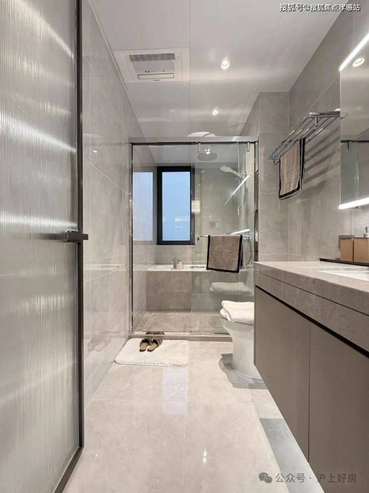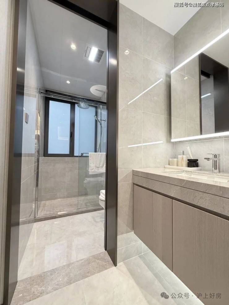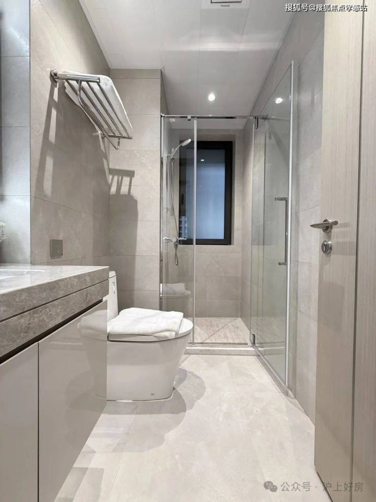 另外,一般百平米主卫淋浴房都是钻石型的,但项目是“一字型”的。“一字型”相比“钻石型”,洗澡空间更大,哪怕带着小朋友也不用挤得“转圈圈”,舒适度提高了不止一点点。