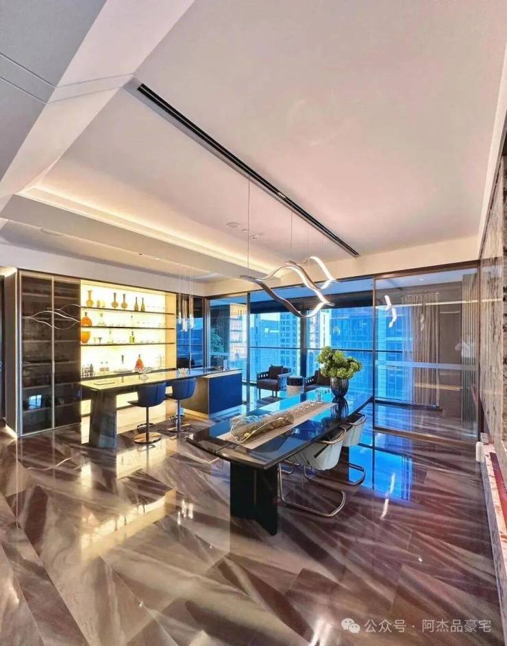 装修上,将时尚与奢华巧妙融入每个角落,所有的窗帘、移门、提升窗、灯光、空调、新风、地暖都可以通过手机远程控制。
