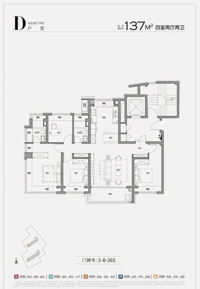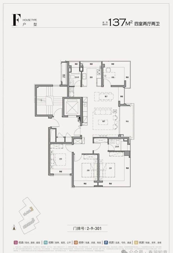 户型设计:得房率高达 91%-94%,空间利用率高。99㎡三房户型为内环罕见的百平米小户型;137㎡四房户型采用西南向无遮挡全景窗设计,可将城市天际线与公园景观尽收眼底。