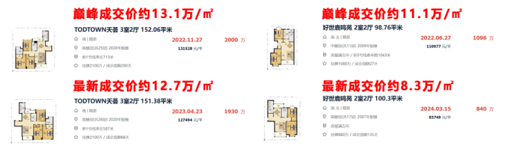 比如莘庄TODTOWN天荟,成交价突破13.1万/㎡,如今最新成交价依旧高达约12.7万/㎡,同区域没有新房,我们取样了同样紧邻莘庄地铁站的好世鹿鸣苑,成交价直逼11.1万/㎡,如今最新成交价仅约8.3万/㎡。