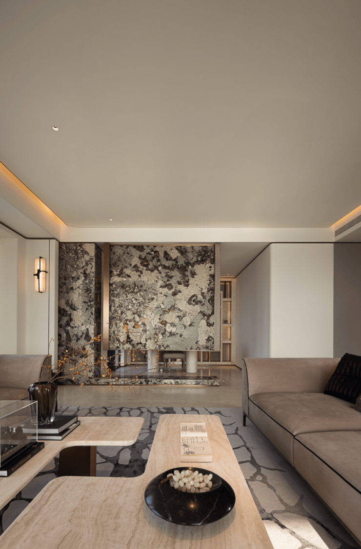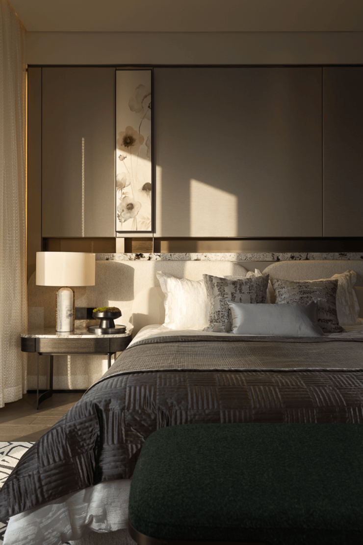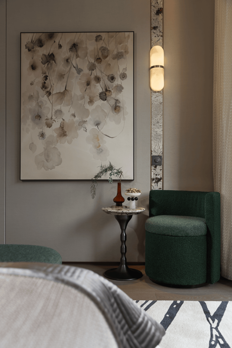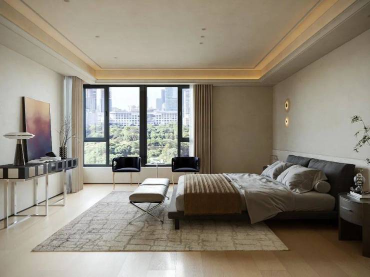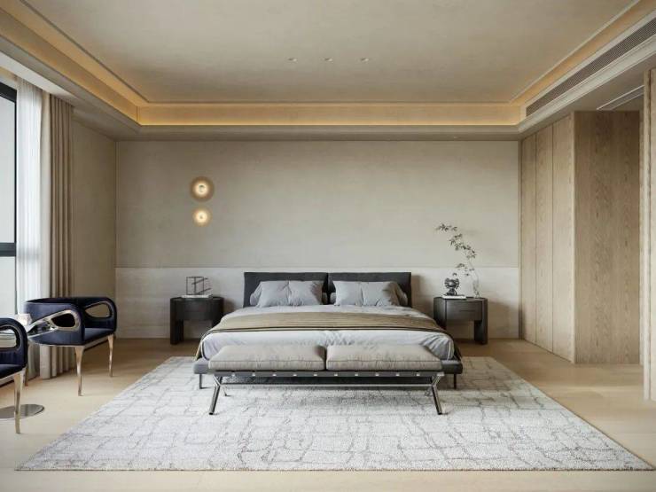 主卧采用留白设计,保留部分家具,摒弃繁复装饰与色彩堆砌,以形体美、轻重色和谐及精准功能布局满足家庭需求。洞石纹板与原生木色搭配,低饱和色调奠定幽远宁静基调。简练线条与天然材质纹理交织,褪去冗余,在素净空间中营造出温润的时光质感。