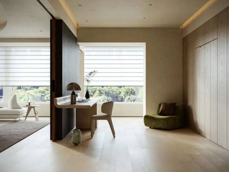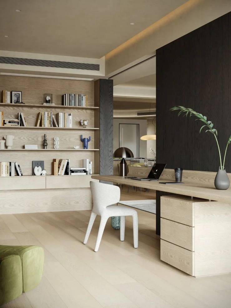 拆除卧室原有隔墙,拓宽空间尺度,引光入室勾勒家的轮廓。口袋移门隐于饰面板隔墙内,赋予书房未来独立成卧的灵活可能。温润木质书桌搭配黑色木饰面,划分功能区的同时,增添空间层次感与韵律感。共享区与多功能书房相互呼应,实现 “各享其趣,抬眸可见” 的理想互动场景。