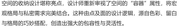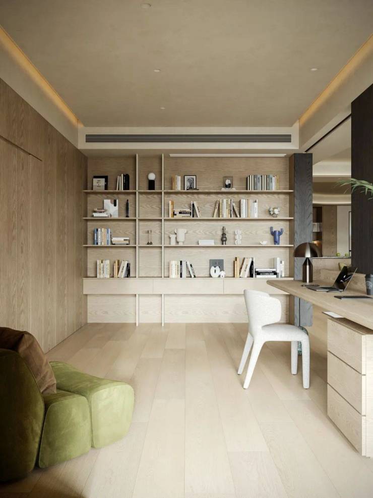 墙面木饰面延续共享区色调,传递温暖氛围。一整排隐藏式收藏柜嵌入墨菲床,在保持整体设计连贯的同时,维持空间整洁有序;另一侧开放式书柜方便取阅书籍,为空间注入生活气息。