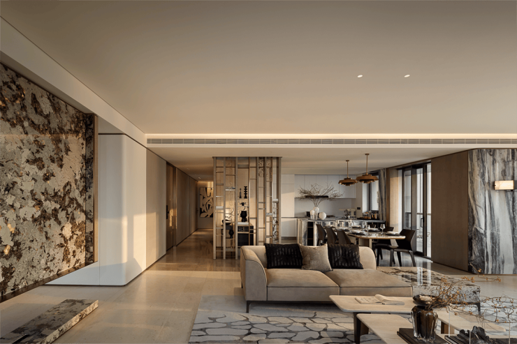 为营造自由通透的空间感,我们规划流畅生活动线。米灰色低饱和模块沙发,以多面体块拼接造型,灵活适配不同视角与布局,成为家庭核心区焦点。它与多功能房、餐厅、水吧等区域形成视觉呼应,构建出 “平行陪伴” 的温馨生活场景。