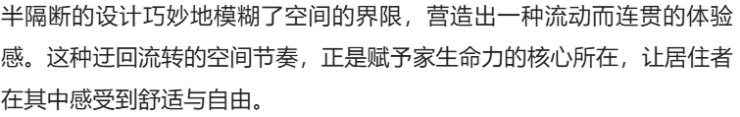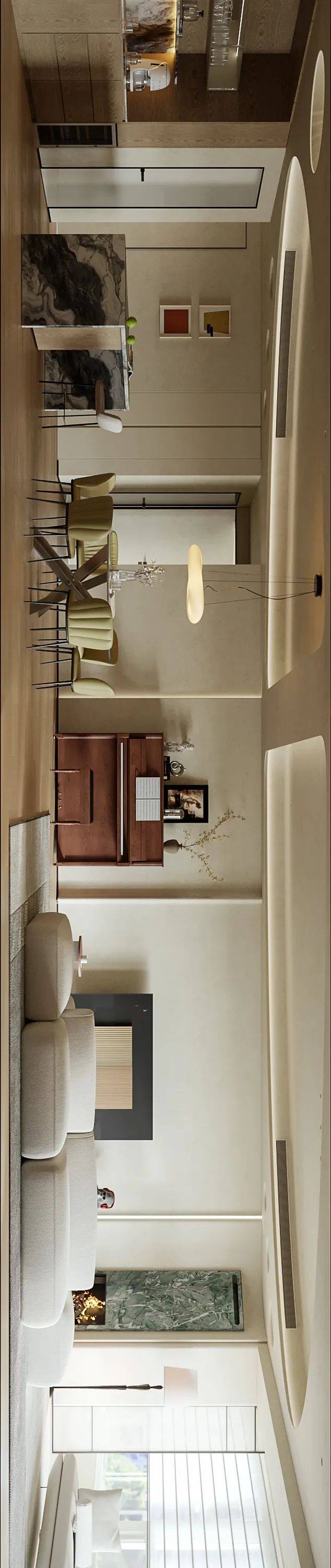 客餐厅以连贯视角奠定视觉基调,顶面弧线替代尖锐线条,贯穿空间削弱压迫感,延伸视觉开阔度。柔和暖色调交织出丰富层次,搭配弯曲线条勾勒轮廓,营造松弛宁静的生活氛围,弧线更成为串联空间的点睛之笔。