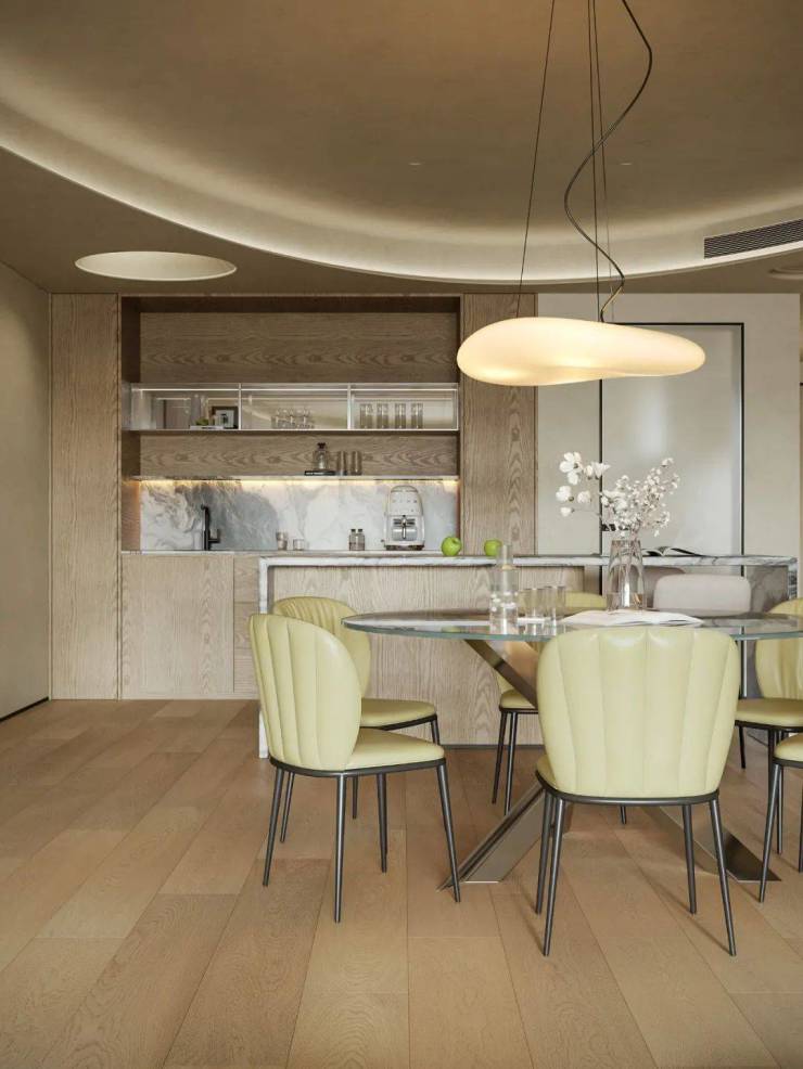 水吧区与餐桌一体化设计,提供连贯收纳功能,使用便捷顺手。通过优化高度、融合材质与结构美学,将空间从单一烹饪区升级为家庭社交核心,平衡功能与美学,营造兼具理性秩序与情感温度的理想就餐场景。