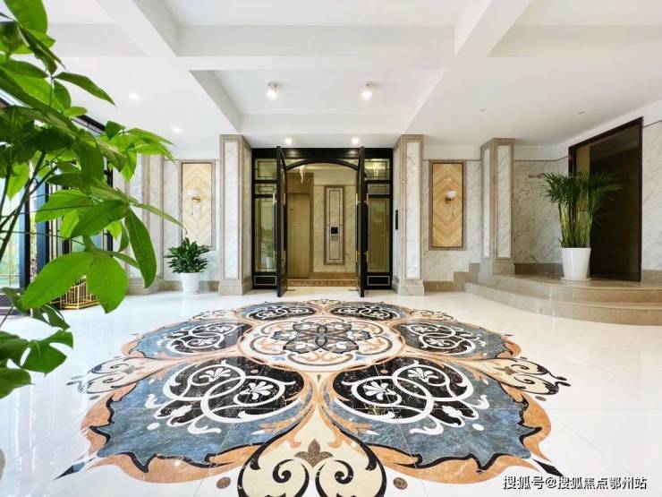每栋楼都是地上地下双入户大堂的设计,一层入户大堂地面采用了曼陀罗拼花造型,而且都是纯手工切割技术打造的定制款,用材精细讲究。
