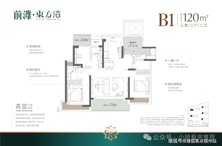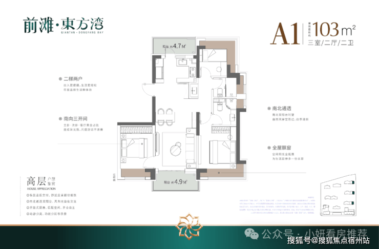 户型建筑层高3.1-3.15米,无连廊,双阳台配置。其中建面约103平户型2梯2户,其余一梯一户。