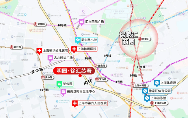 项目周边四轨环绕:与3、4、9号线宜山路站,直线距离695米!与15号线吴中路站,直线距离约680米,通达上海市中心!