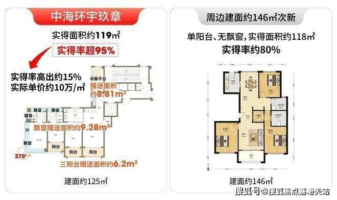 环宇玖章125户型实得率超95%,而宝华项目实得率仅约80%。按同等实用面积折算,环宇玖章实际单价就更划算,仅约10万/㎡