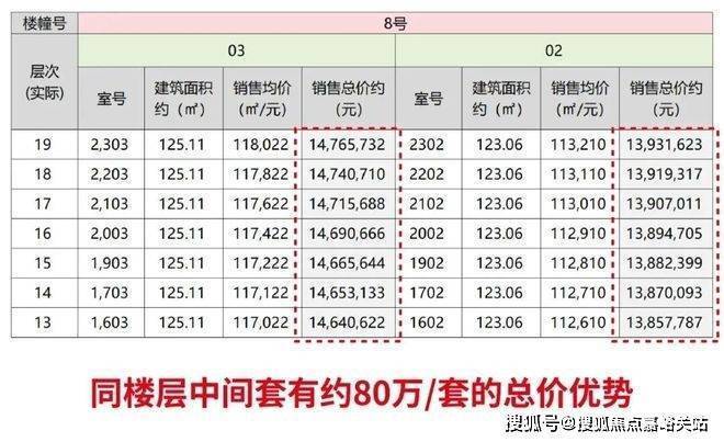 首先,中间套与同楼层边套相比,总价差约80-90万,差额相当于一辆豪车价。