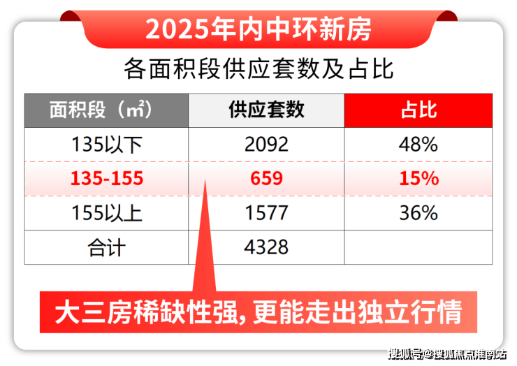 对比市场:百平米或120㎡左右三房空间紧凑,难满足舒适需求;155㎡以上四房总价偏高。该面积段大三房既能保证空间宽敞,又能控制总价,稀缺性显著。