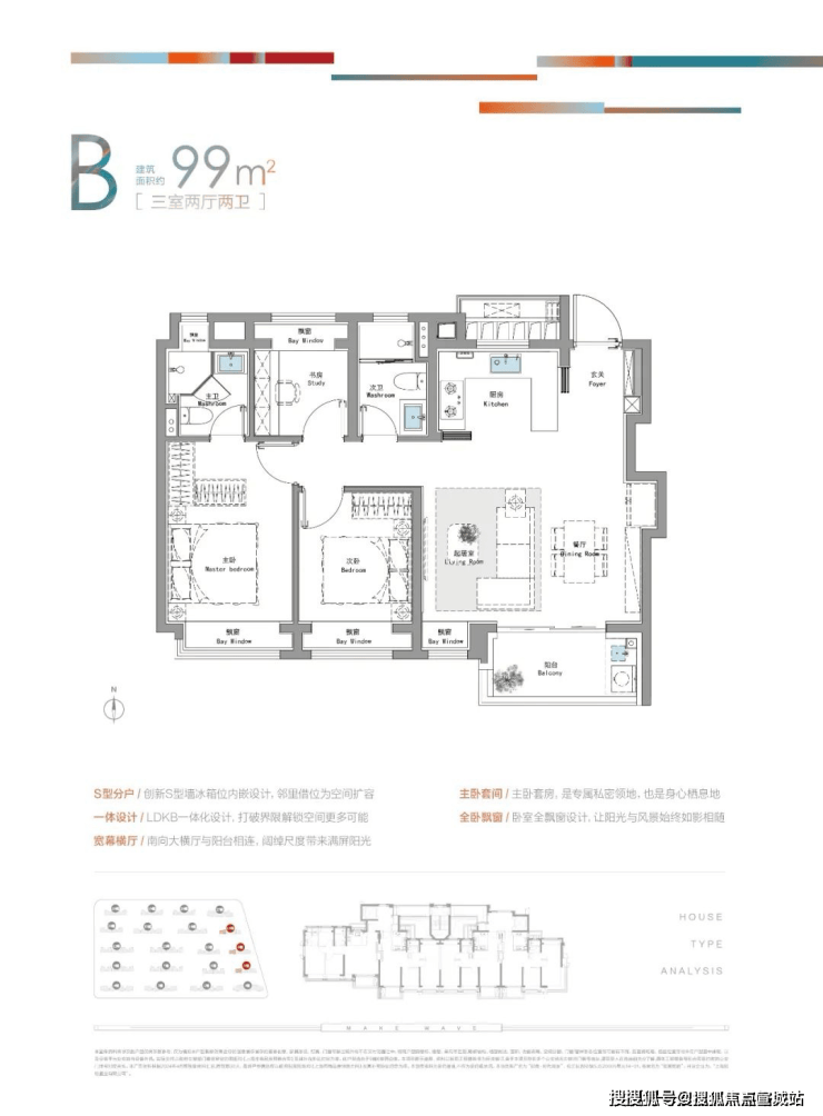 建面约99㎡三房:该户型是典型的飞机格局,很大程度上提高了使用率