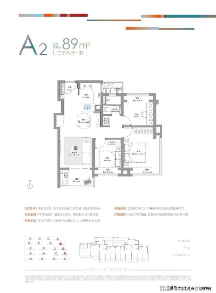 建面约89㎡3房户型:东边套主卧配置约270°双向采光飘窗、S墙设计,主力总价仅约450万级,首付约90万起!