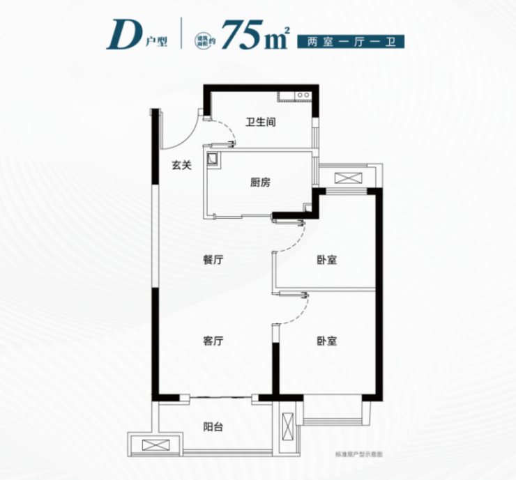 建筑面积约75㎡两房:宽大阳台,明厨明卫,总价低,户型动线高效。