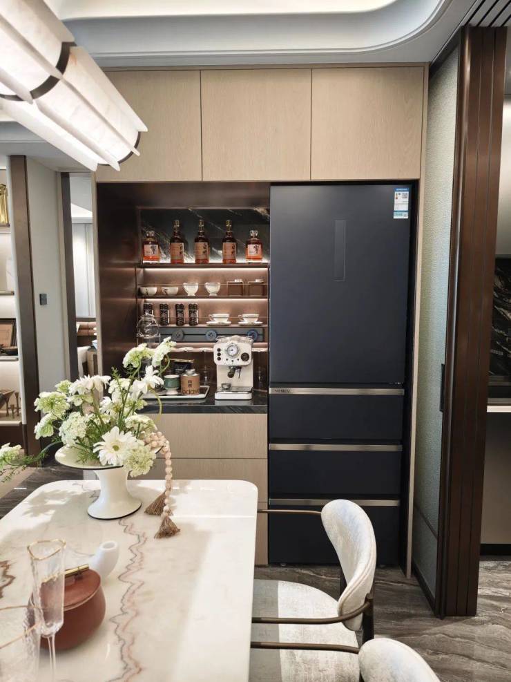 而餐厅外的餐桌旁则交付了一个完整的餐边柜,并带一个西门子的冰箱.