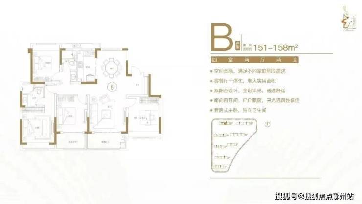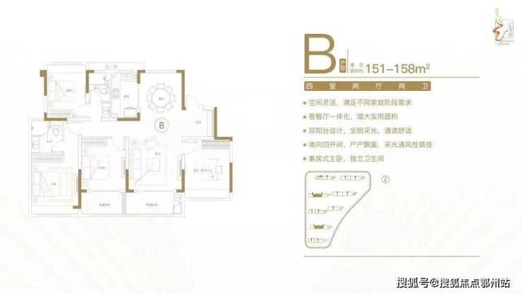 建面约151-158㎡四室两厅两卫户型特点:客餐厅一体化,空间实用,尺度开阔;多功能间设计,满足不同居住需求;全明采光布局,横厅设计,明厨明卫;南向四开间,主生活区域朝南,阳光清风常伴;套房式主卧,主卧带飘窗,独立衣帽卫。