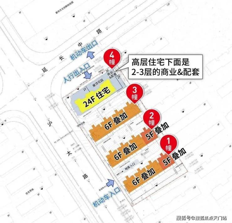 项目采用高低配设计, 总计175套房源,项目由一栋24层高层和3栋5-6层叠墅组成,高层105套(108至123㎡ 3房4房)、叠墅70套(180到220 ㎡ ),自4层起架于3层商业之上。