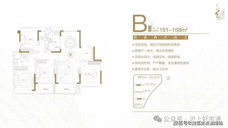 建面约151-158㎡四室两厅两卫户型特点:空间灵活,满足不同家庭阶段需求;客餐厅一体化,增大实用面积;双阳台设计,全明采光,通透舒适;南向四开间,户户飘窗,采光通风性俱佳;套房式主卧,独立卫生间。