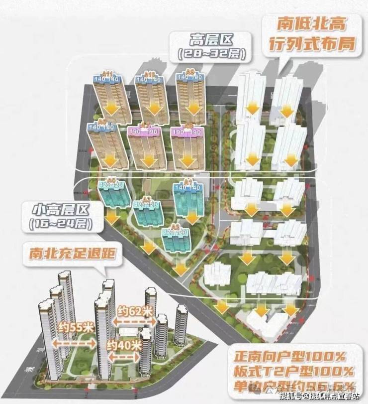 项目首期地块采用了经典的南低北高行列式布局,且所有楼栋均为T2板式独栋。