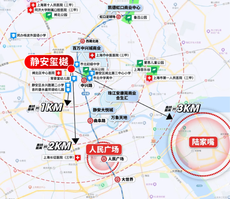而静安玺樾到外滩和平饭店的直线距离正好是约3公里!妥妥的城心烫金地段!