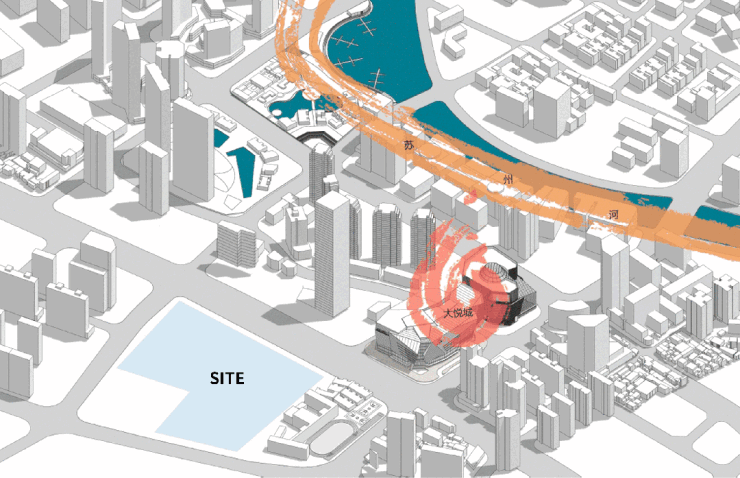 项目扎根于石窟门里弄文化和华界工厂精神悠久流传的苏河文化区,大悦城北侧,与南京东路商圈衔接。坐拥黄浦江最佳江湾景观,汇聚得天独厚商业资源的天然生活会客厅。复杂的城市环境和深远的历史文脉是挑战同时也是机遇。