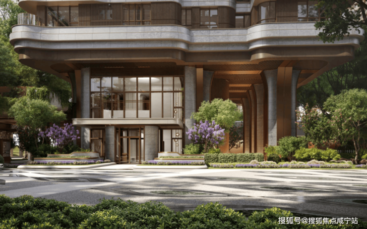 在外立面的设计上,采用了柔曲化的边缘,像这种“飘带”线条,采用了进口浅色花岗岩结合金属铝板包边,形成“金镶玉”的高级感,整个建筑俯瞰仿佛是蝴蝶的翅膀,也可以使人联想到黄浦江面的水波荡漾,您会感觉到整个造型都是流动的感觉。这样的设计还有一个好处,角部的阳台是270度的,能够最大程度饱览江面,包括南向的主要房间,也可以通过立面上弧线的部分看到北面的江景。