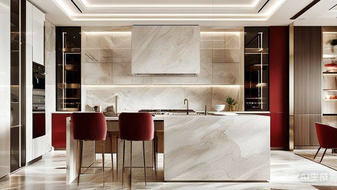 在石材运用上,项目同样展现出非凡格调。银河白奢石、GUCCI红、宝格丽棕等顶级材质被大胆启用,这些通常只出现在亿元级豪宅中的配置,如今竟出现在建面约101-188㎡的改善型产品中。特别是厨房操作台采用整块弧形石材拼接而成,不仅视觉效果惊艳,更解决了传统直角台面容易藏污纳垢的问题。当我伸手触摸那温润细腻的表面时,真切感受到什么是“看得见的奢华”。