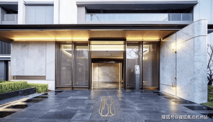 地上入户大堂方面,在造型上运用了中式元素挑檐,搭配香槟金型材金石嵌套设计,显示出一种精致奢华却内敛的感觉。