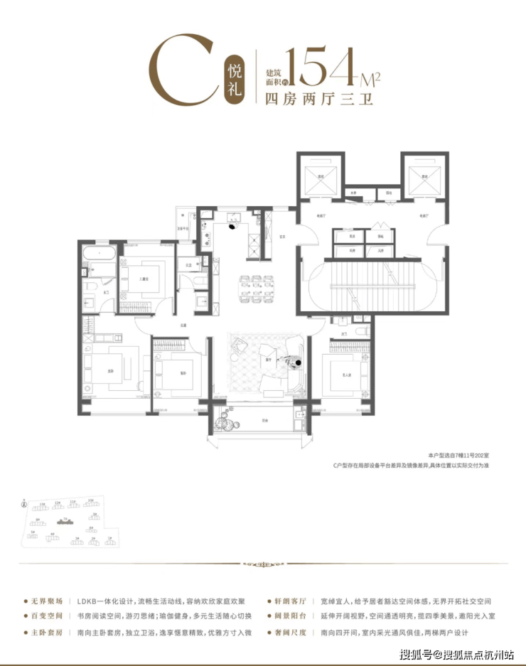 154㎡四房:14.7 米南向面宽、双套房设计,三代同堂从容居住。