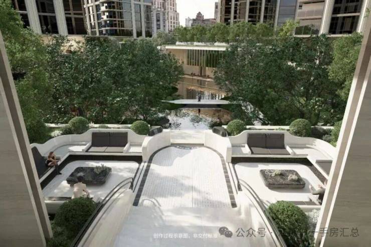 “回归之境”以3500㎡下沉水苑为核心,汇聚会客、泳池、茶室等多功能空间,形成仪式感十足的社区舞台。