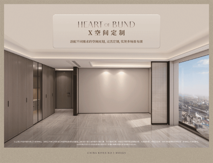 项目的滨江大户型,以无界平层结构,配合3.3米层高(部分)和全景落地窗打造270°环幕江景舱,实现上海滨江市场罕见的 环幕江景视野!