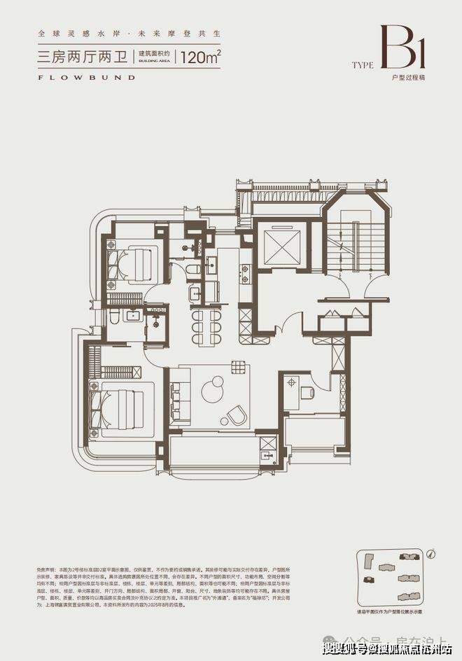 建面约120㎡3房2卫户型